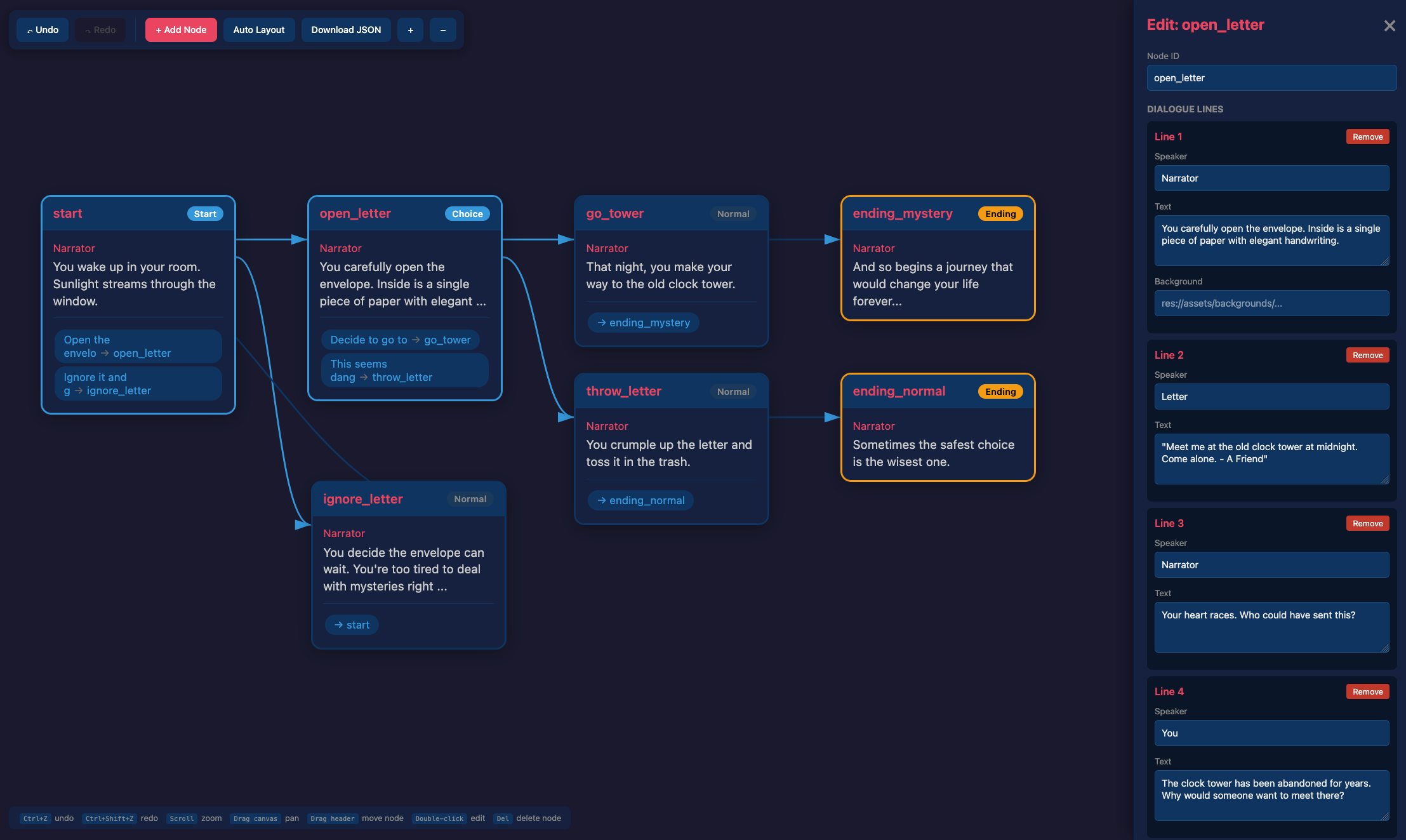 Visual Node Editor — Interactive HTML editor for story structure. Claude generates this to visualize branching narratives, then references it when making story changes.